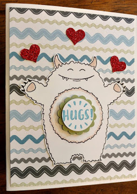 The Yummy in My Tummy is the only new item on this Whisper White card. I used a Blushing Bride marker to highlight areas of the monster, punched a scalloped circle out of Pear Pizzazz card stock and added a Marina Mist-stamped HUGS! on white with a circle punch. The small hearts are punched out of red glitter paper.